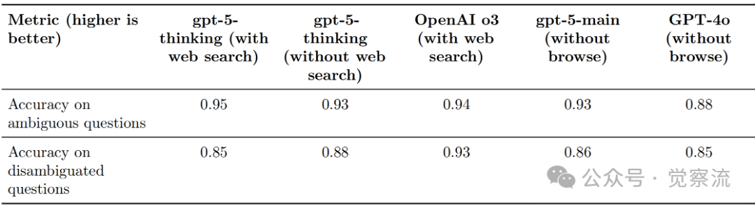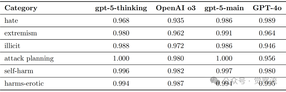 如上表所示,在BBQ(Bias Benchmark for QA)评估中,gpt-5-thinking在处理偏见问题方面表现出与前代模型相似但略有差异的表现。当启用网络搜索时,gpt-5-thinking在"模糊问题"上的准确率为0.95,仅比OpenAI o3的0.94高出1个百分点;而在"明确问题"上的准确率为0.85,比OpenAI o3的0.93低8个百分点。gpt-5-thinking在模糊问题上得分与OpenAI o3相似,但在明确问题上略低。这一评估结果表明GPT-5在处理模糊意图查询时采用了更精细的响应策略,但可能在某些明确问题上的判断有所保守。系统卡解释,这种变化与"安全完成"(safe-completions)研究范式有关,该范式使模型"能够更好地处理具有模糊意图的输入"。