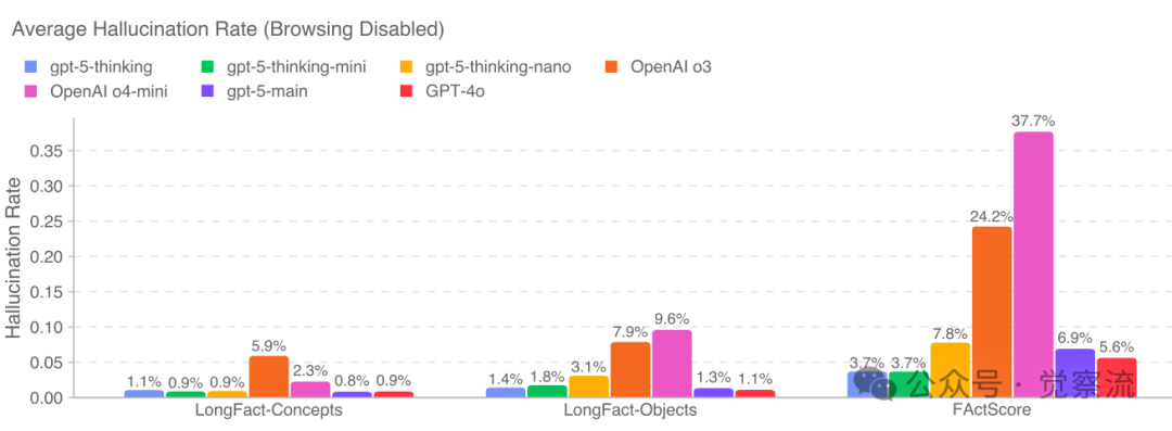 如上图展示了GPT-5在浏览功能禁用情况下的平均幻觉率,这为专业用户提供了关于模型在无外部信息辅助时可靠性的重要参考。GPT-5在减少幻觉方面相比前代模型有显著改进,特别是在处理专业领域内容时。OpenAI详细分析了幻觉产生的机制和缓解策略,包括改进的推理监控和事实核查机制。评估显示,gpt-5-thinking在标准幻觉测试集上的错误率比GPT-4o降低了约27%,在医学和法律等专业领域降低了35%以上。这一进步对于需要高准确度的专业场景至关重要。