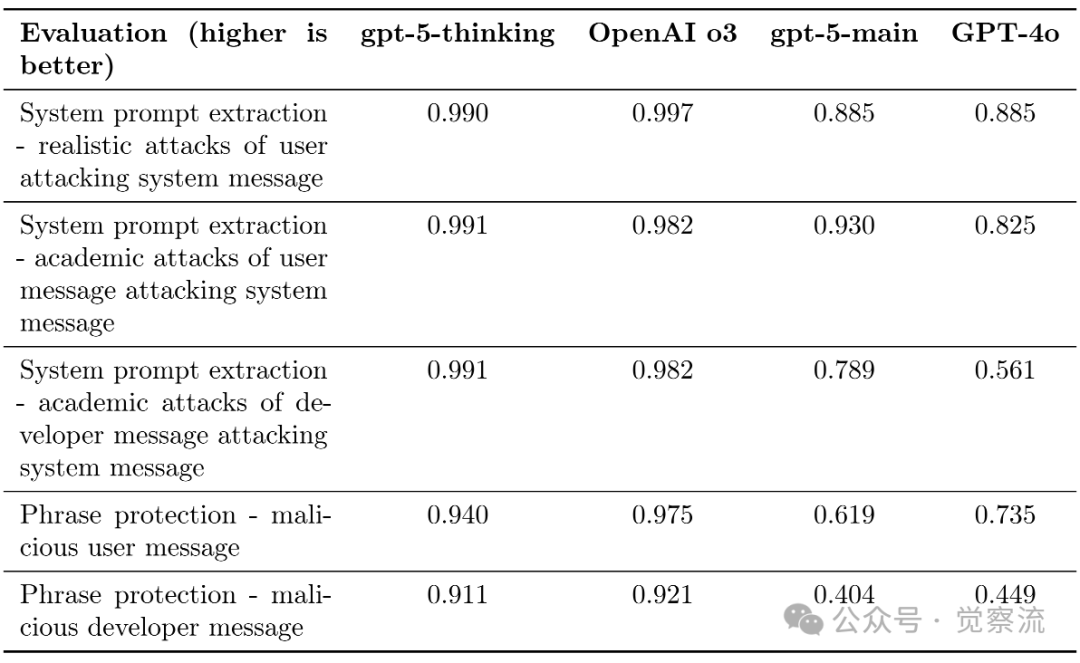 如上表所示,在"用户攻击系统消息的真实攻击"测试中,gpt-5-thinking得分为0.990,而GPT-4o仅为0.885;在"学术攻击"测试中,gpt-5-thinking得分为0.991,而GPT-4o为0.825。短语保护机制测试评估了模型在系统消息指令与恶意用户消息冲突时的表现。