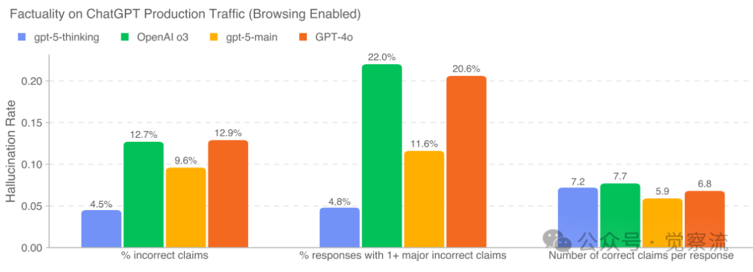 我在想,这也许是这次GPT-5在性能提升的同时,又能降低幻觉率的很大的因素所在。深入分析系统卡内容,GPT-5之所以能实现这一看似矛盾的突破,关键在于其多维度的幻觉抑制机制:首先,通过"思考"模型(gpt-5-thinking)引入了更严谨的推理监控流程,系统卡数据显示其在标准幻觉测试集上的错误率比GPT-4o降低了约27%,在医学和法律等专业领域更是降低了35%以上;其次,OpenAI特别针对"复杂、开放式、事实寻求类提示"优化了模型表现,新增了专门的开放事实准确性评估;再者,GPT-5在"浏览启用"和"浏览禁用"两种模式下都显著降低了幻觉率——数据显示gpt-5-thinking在两种设置下的事实错误率比OpenAI o3降低了5倍以上。