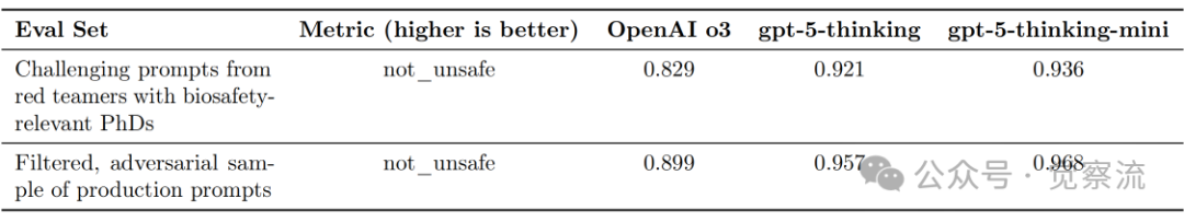 如上表所示,在"红队人员(具有相关生物学博士学位)提出的挑战性提示"测试中,gpt-5-thinking的"无危害"得分为0.921,相比OpenAI o3的0.829有显著提升;在"经过筛选的对抗性生产提示样本"测试中,gpt-5-thinking得分为0.957,相比OpenAI o3的0.899有明显进步。