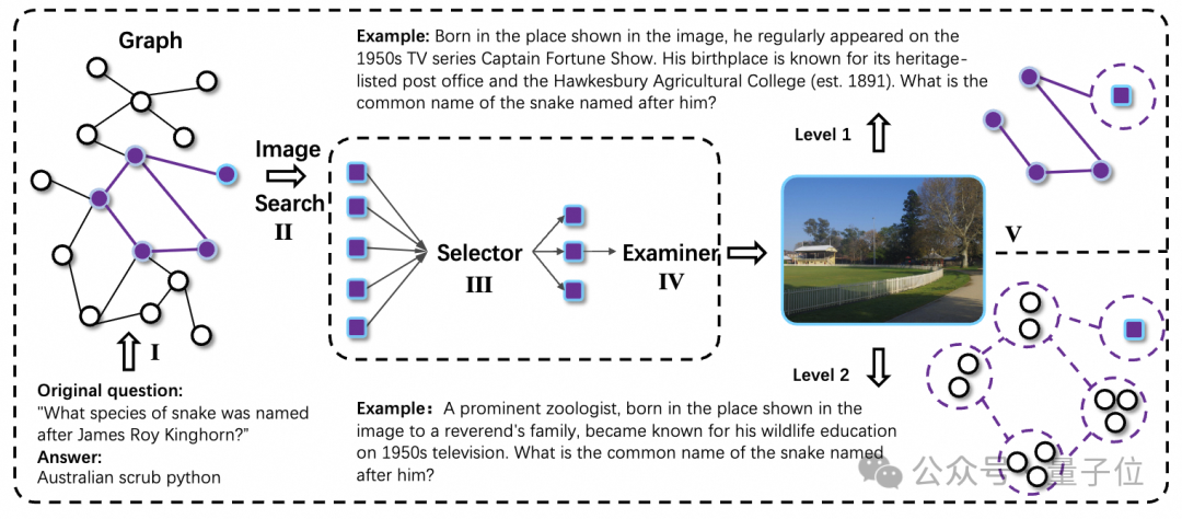 随机游走收集跨模态知识链研究团队在多源网页(文本、图片、混合页面)中进行随机游走采样,构建多领域实体图谱。不同于传统的线性多跳问答链,这种图谱连接稠密、路径不固定,问题的解决路线难以预设,逼迫模型探索性地组合视觉信息。