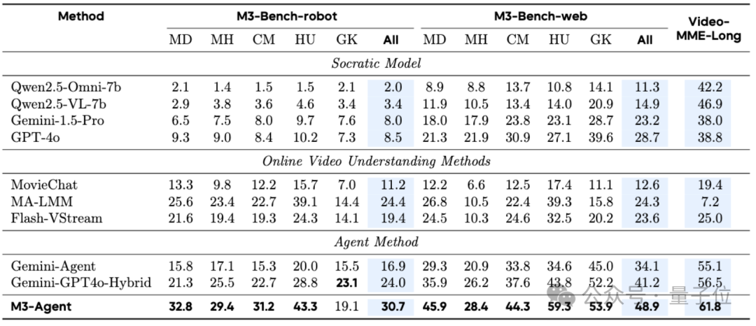 实验表明,通过强化学习训练的M3-Agent在多个基准测试中表现均显著优于基线模型(包括基于商业模型如Gemini-1.5-Pro和GPT-4o的智能体)。