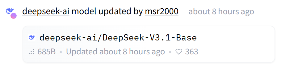 昨晚,深度求索在用户群里宣布「DeepSeek 线上模型版本已升级至 V3.1,上下文长度拓展至 128k」并更新了 UI (去掉了 DeepThink 旁的 R1 标示)之后,在 Hugging Face 发布了一款新模型 DeepSeek-V3.1-Base。