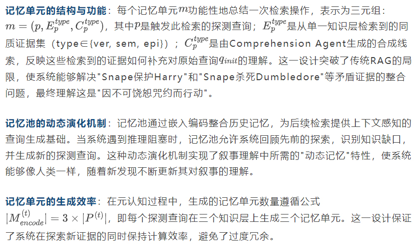 技术贡献:ComoRAG的核心贡献在于将RAG从静态检索转变为动态认知循环,通过记忆组织解决了叙事理解中的三个关键挑战: