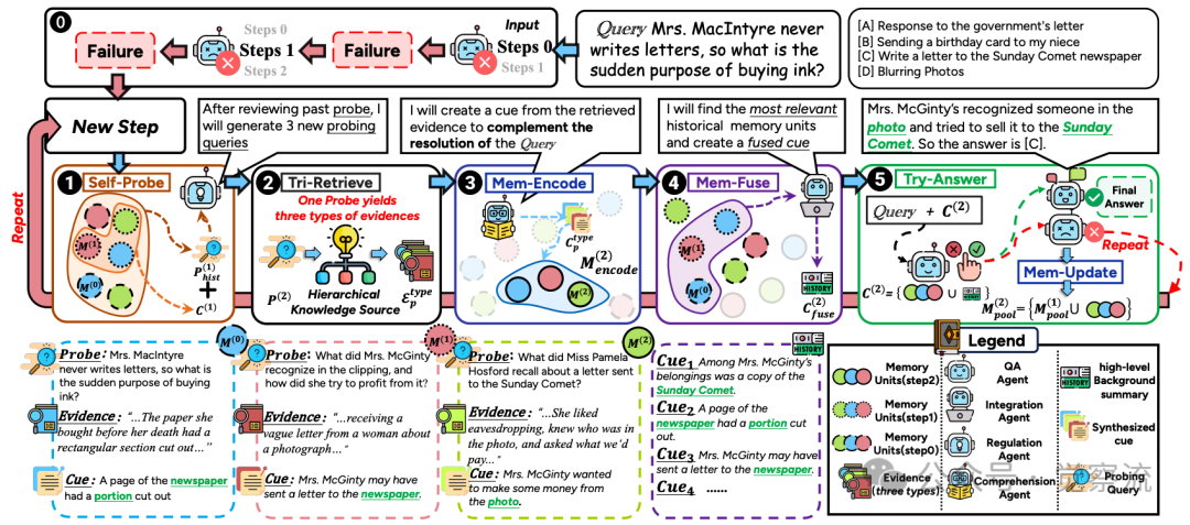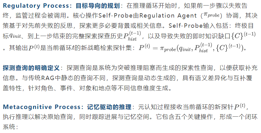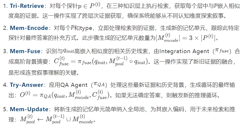 这五个操作——从Self-Probe生成新探针,到Tri-Retrieve获取证据,Mem-Encode形成记忆,Mem-Fuse整合新旧知识,Try-Answer尝试解答,再到Mem-Update更新记忆池——共同构成了一个完整的、自我迭代的认知循环。当Try-Answer失败时,系统会利用更新后的记忆池再次启动Self-Probe,从而形成一个不断演化的推理状态闭环,如下图所示。