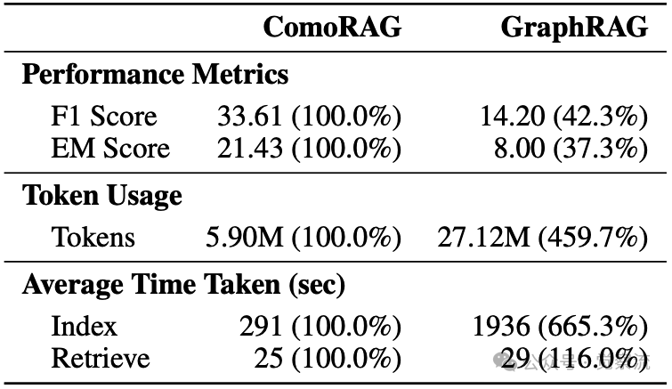 ComoRAG和GraphRAG的性能、Token 使用量及平均时间对比