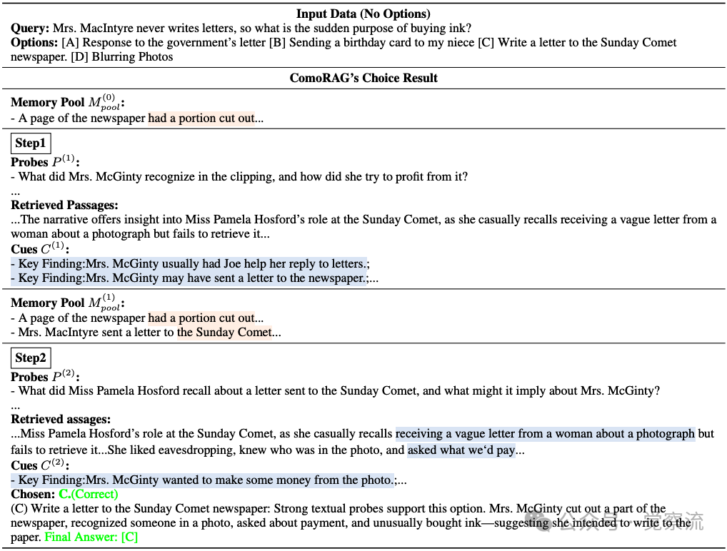 如上案例研究清晰展示了关键证据(蓝色标记)和关键线索(橙色标记)如何共同支持正确答案。关键证据包括"报纸被剪掉部分"、"Mrs. McGinty认出照片中的人"和"询问报酬";关键线索则是这些证据如何共同指向"写信给报纸"的目的。这种证据-线索的对应关系是ComoRAG成功的关键机制。