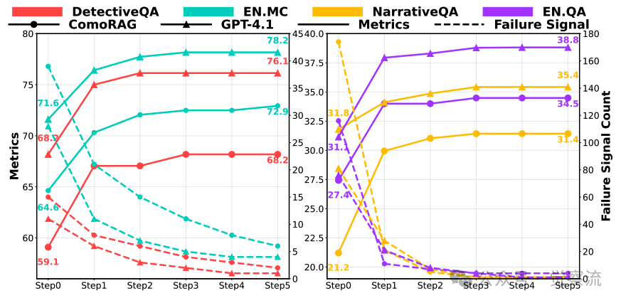 ComoRAG代表了从静态检索到状态式推理的范式转变,通过动态记忆工作区解决了矛盾证据整合问题,其元认知控制循环成功模仿了人类前额叶皮层的功能。在四大长叙事基准测试中,它持续超越各类强基线,特别是在需要全局理解的叙事型查询上实现高达19%的相对F1提升。