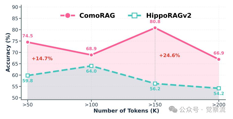 适用场景判断:ComoRAG特别适合需要全局情节理解的叙事型查询,如文学分析、侦探小说推理或长篇法律文档解析。对于简单事实型查询,传统单步RAG可能已足够。资源考量方面,ComoRAG的计算成本略高于单步RAG(主要来自多轮推理),但显著低于处理全上下文的LLM,提供了性能与效率的良好平衡。特别适合处理200k+ tokens的长文档,其中对于超过15万token的长文档,准确率优势达到峰值,高出 24.6个百分点。