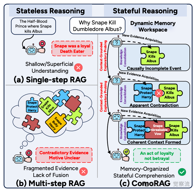传统RAG方法在处理这类问题时面临"无状态"局限性。单步检索往往只能获取片段化证据,无法整合矛盾信息。以"Snape杀死Dumbledore"为例,单步RAG可能检索到"Snape是忠诚食死徒"和"Snape杀死Dumbledore"的证据,却无法将这些与"Snape保护Harry"的矛盾证据融合,导致错误推断。
