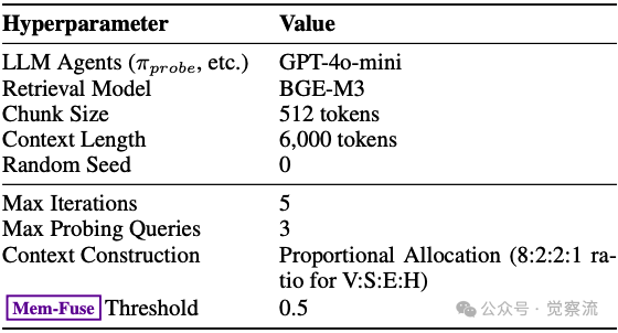 - "Mem-Fuse阈值"设为0.5:表示转发到Integration Agent进行记忆融合的证据比例,这一设置平衡了新旧证据的权重