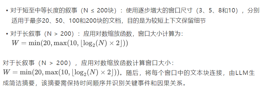 情节层(Episodic Layer):前两层提供了事实细节和高级概念的视角,但缺乏对叙事中至关重要的时序发展或情节进展的捕捉。情节层通过滑动窗口摘要机制重构情节线和故事弧线,捕获按时间线连续或因果相关事件的序列叙事发展。窗口大小根据文档长度动态调整:
