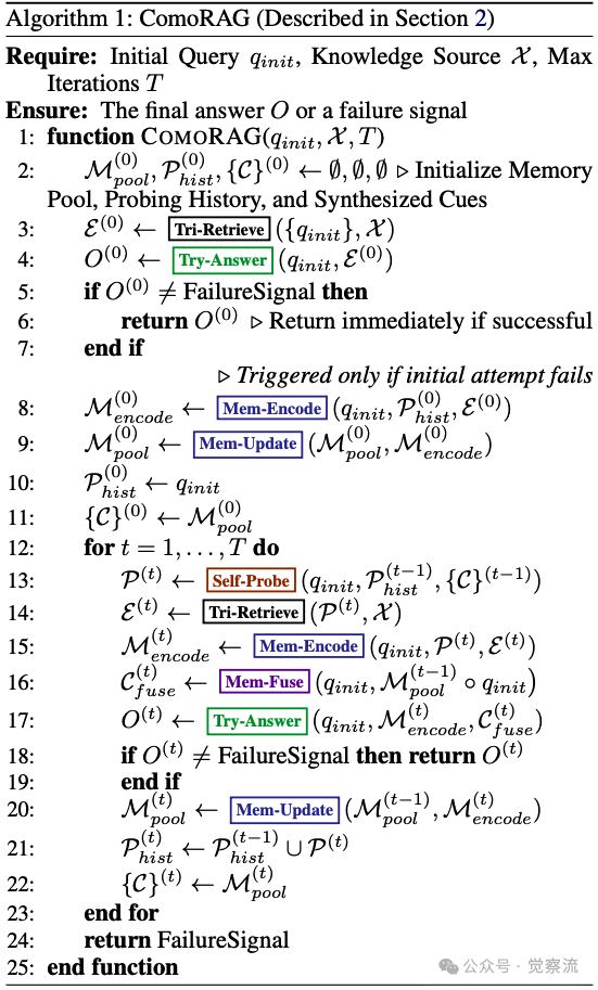为了更精确地描述ComoRAG的完整工作流程,可以参考其核心算法的伪代码实现,如下图所示: