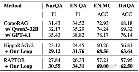 具体集成步骤为:"将ComoRAG的元认知循环作为插件集成到现有RAG框架中,保留原有索引结构但增加记忆工作区组件,使系统能够跟踪和整合多轮推理状态"。如下表实验结果证实,这种集成方式与RAPTOR结合带来21%的准确率提升,与HippoRAGv2结合带来8.3%的提升。