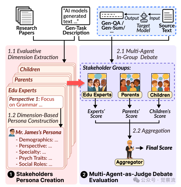 上图,MAJ-EVAL的两步设计流程。第一步,从研究文献中提取利益相关者视角并构建角色;第二步,通过多智能体辩论生成评估结果。