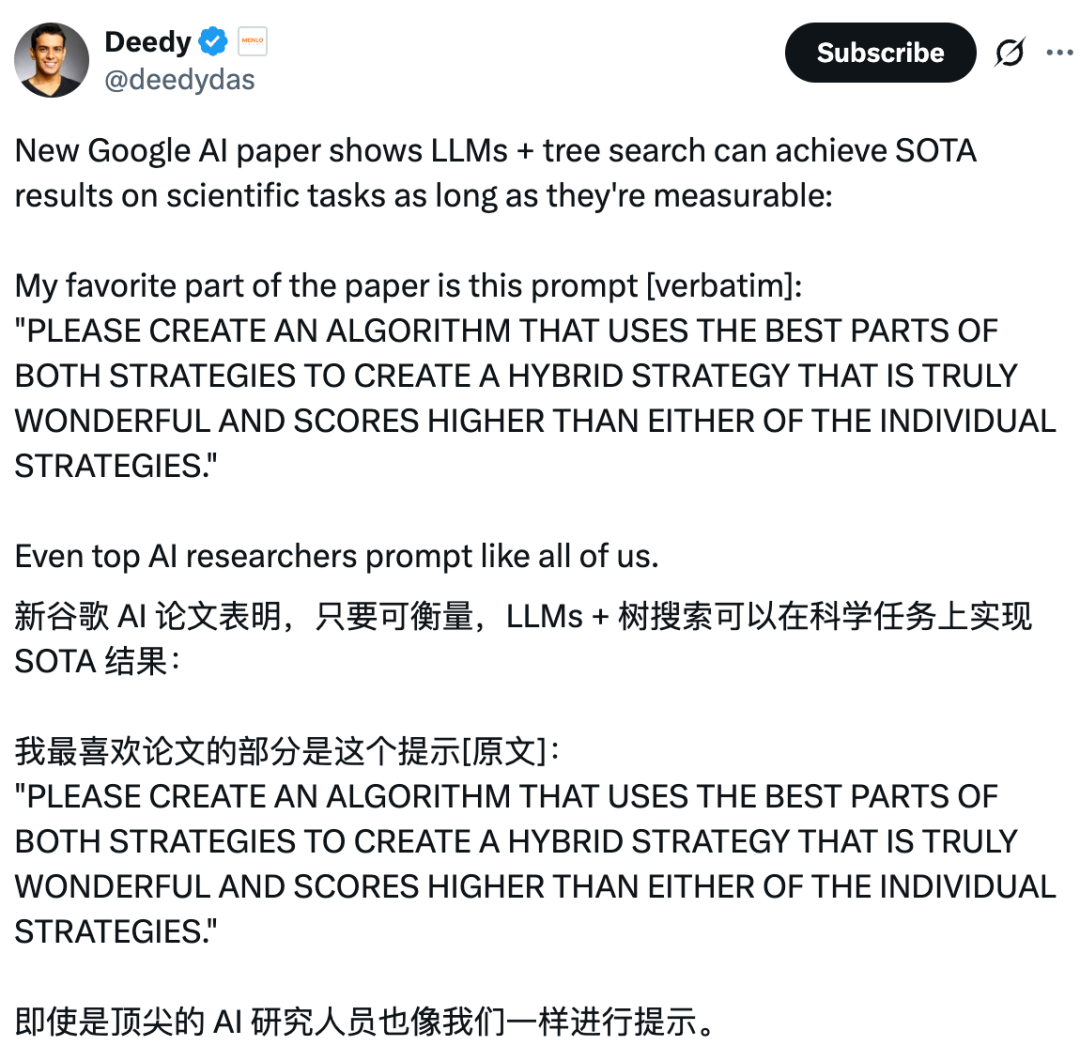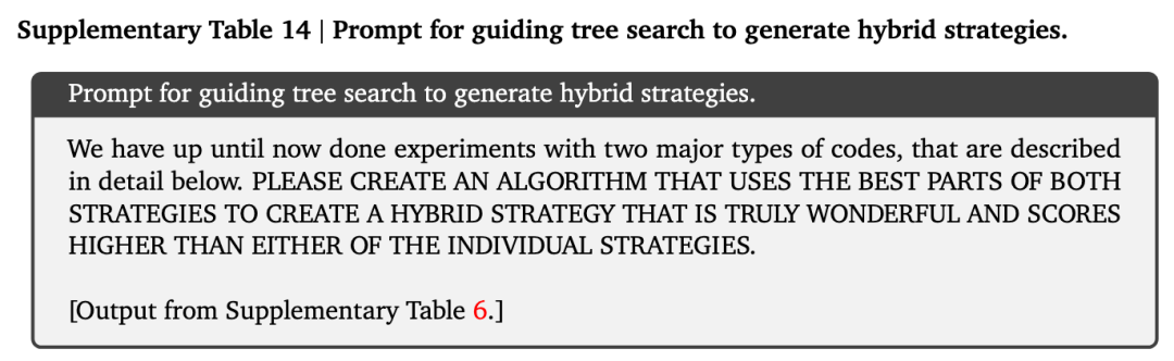 论文中使用的指令:「请创建一种算法,结合两种策略的优点,形成一种真正出色的混合策略,并且其得分要高于任一单独策略。」说明优秀的结果并不总需要非常复杂的 Prompt 指令。