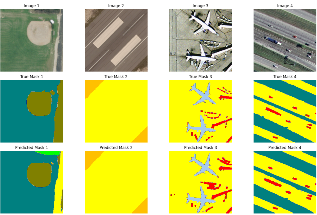 图 3:卫星图像分割结果示例,显示原始图像(顶行)、真实掩模(中行)和系统预测(底行)。系统成功分割了包括机场、跑道、飞机和基础设施在内的各种特征。