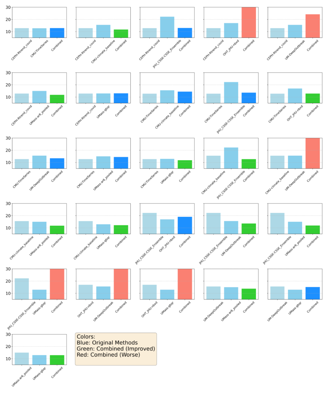 图 5:方法重组结果分析,显示原始方法与其组合版本之间的性能比较。绿色条表示成功的改进,红色条表示性能下降,而蓝色表示原始方法的性能。