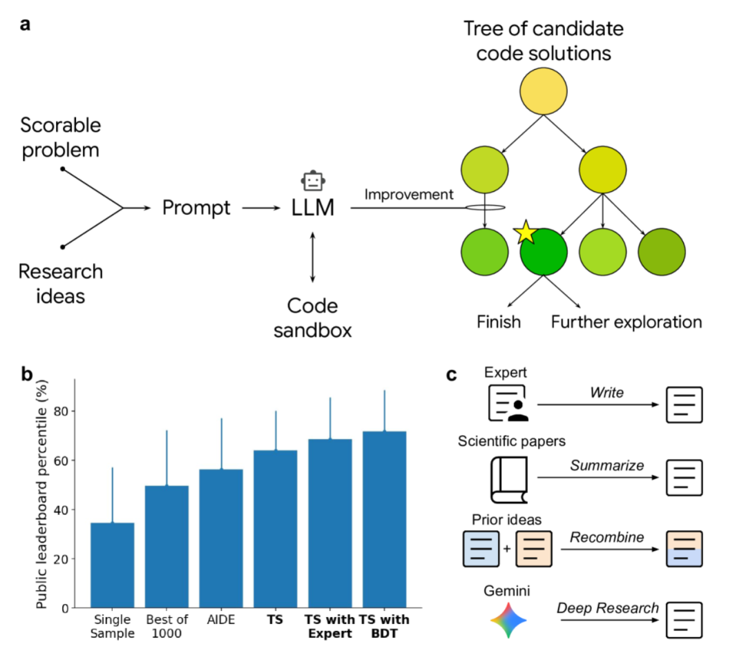 该系统融合了大语言模型和传统树搜索,能够自动编写和优化科研任务中所需的软件程序,能够获取多种渠道的现有知识,整合并且重组这些知识来构建一个新的研究思路。