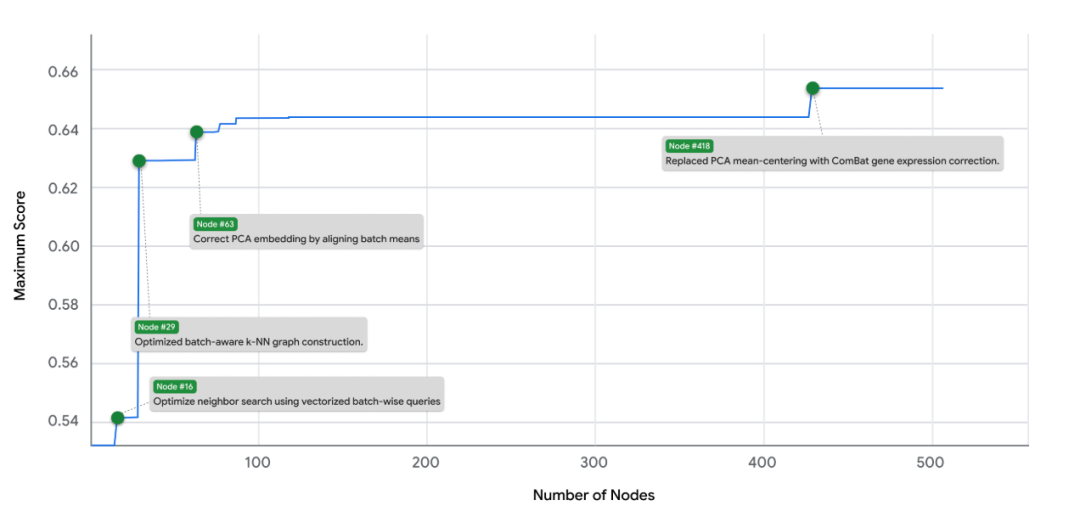 图 2:树搜索进展图,显示了迭代过程中性能的提高,并在突破点处标注了关键算法创新。该系统发现了优化批次感知图构建和实现 ComBat 基因表达校正的方法。