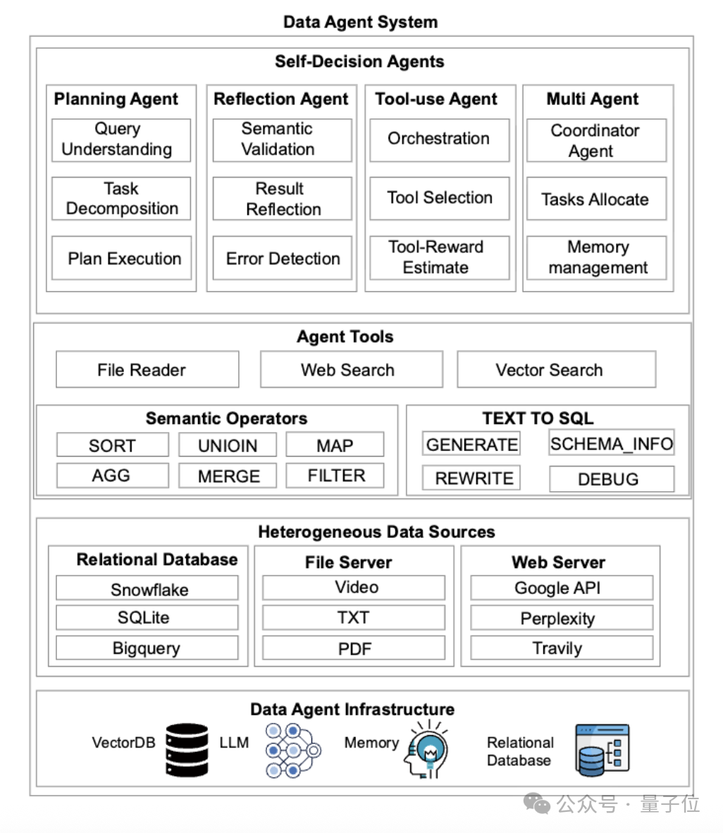 团队还设计了统一Agent-Expert协作框架,同时支持Data Agent、RAG、语义算子以及四种典型Data Agent工作流模式(规划Planning、工具使用Tool-use、反思Reflection、多智能体Multi-Agent),可无缝集成不同Data Agent系统架构。