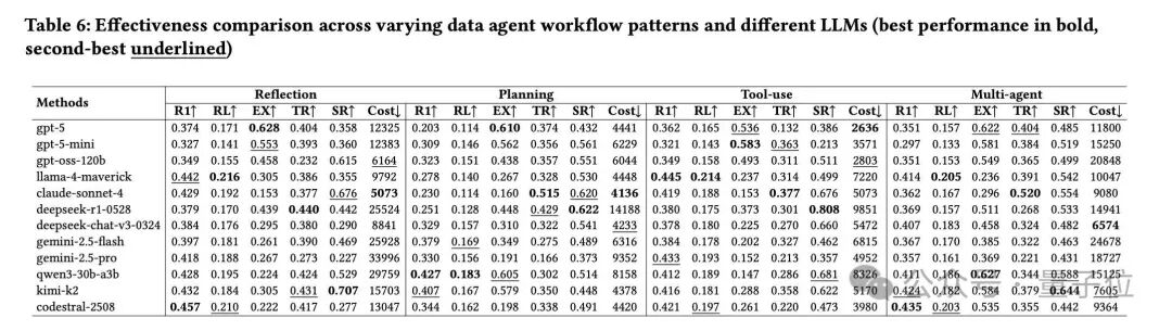 - 模型-架构适配性大规模Agenic Data下预训练的模型即使是Non-Thinking Model(如Kimi-k2)在复杂Multi-Agent和Reflection架构下依旧表现突出,一些Thinking Model(如DeepSeek-R1)在复杂Data Agent架构中反而出现“双重推理惩罚”现象,这表明模型选择需要匹配架构复杂度。