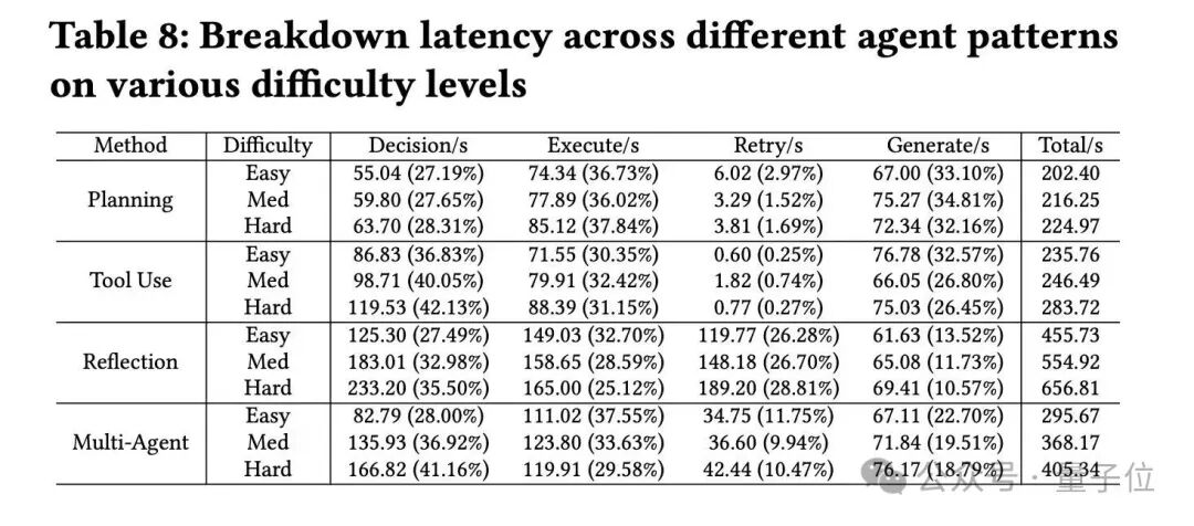 - 计算资源重分配效应观察到不同Data Agent架构本质是通过重新分配计算开销实现优化——Reflection架构将26-29%计算用于重试机制换取高质量输出,Planning架构将32-35%用于生成阶段保证效率,这种“认知负载重分配”为根据任务场景选择合适架构提供了量化指导