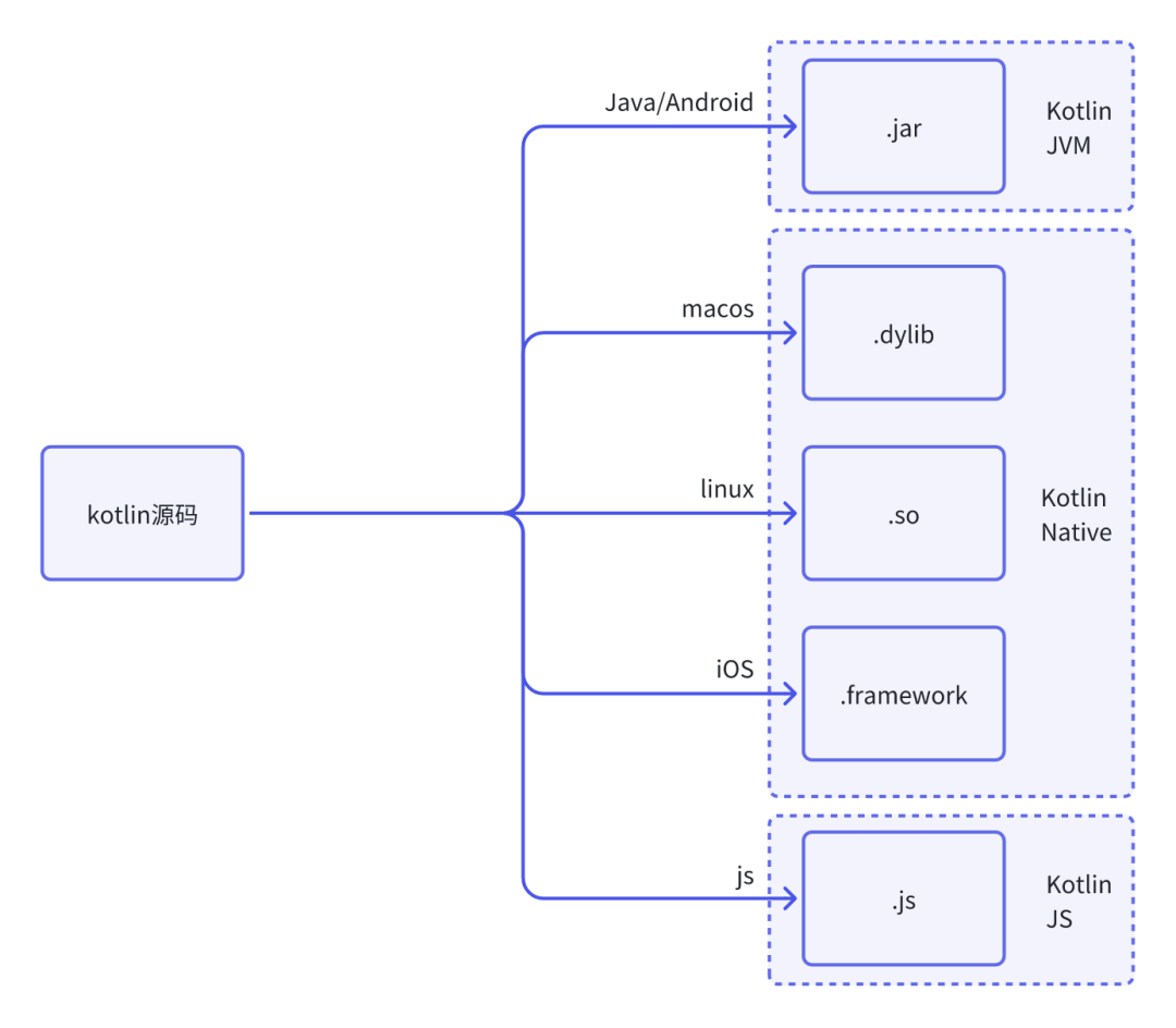 而与诸如 Java / React 这类跨端方案不同,KMP 没有采用所谓的虚拟机的思路,而是选择直接将 kotlin 源码编译成目标平台代码运行的方案。