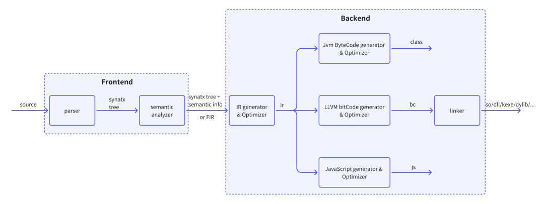 简单来说,前端负责语法解析&代码分析、后端负责将前端产物翻译成目标平台代码,二者职责清晰。未来如果如果需要支持一个新平台,添加一个新后端即可。