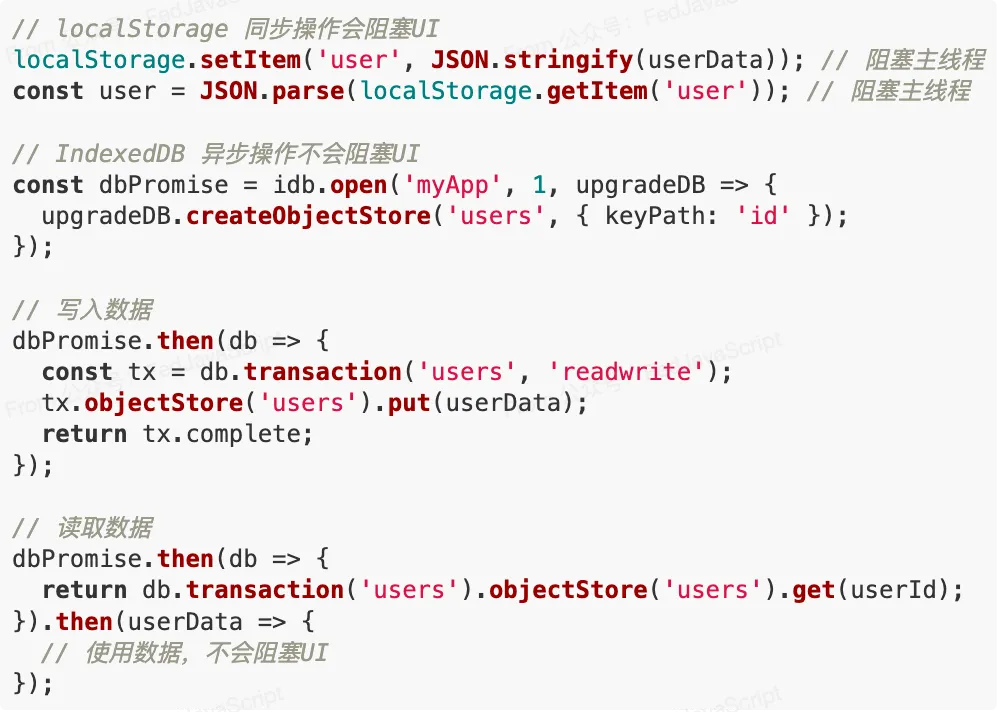与 localStorage 的同步操作不同,IndexedDB 采用异步 API,所有操作都不会阻塞主线程: