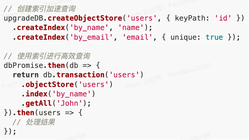 与 localStorage 的简单键值对不同,IndexedDB 提供了类似数据库的高级特性: