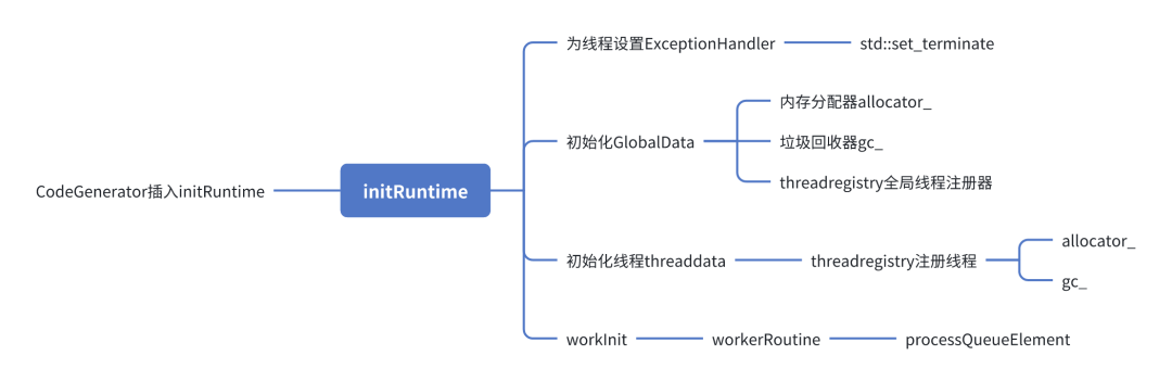 WorkInit 将 Work 的 thread_变量设置为线程自己,workRoutine 通过 pthread_create 创建新线程 thread_来执行。线程通过 kotlin 代码/c++代码创建,创建好线程之后调用 initRuntime 来初始化。