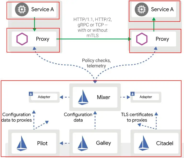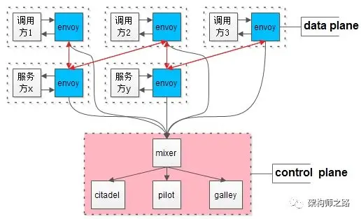 (2) 数据平面,由一系列proxy组成(中间一层的两个小红框),核心职责是: