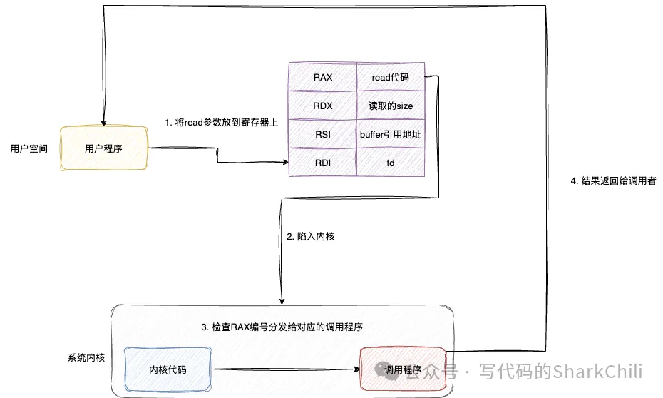 操作系统本质上是针对用户程序的抽象和系统资源的统一管理,对于日常的I/O调用,应用程序执行时会将参数存放到有限的寄存器上或堆栈上,然后陷阱指令(对应x86-64 CPU也就是syscall指令)进入Linux内核,此时内核代码就会根据RAX寄存器中的系统调用号定位到对应的内核函数执行系统调用,并将结果以函数返回值的方式返回给应用程序。