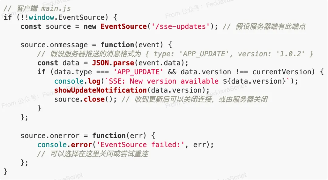 - 原理:客户端与服务器建立一个单向的持久连接,服务器可以在任何时候向客户端推送消息。当有新版本部署时,服务器可以主动推送一个“更新”事件给所有连接的客户端。