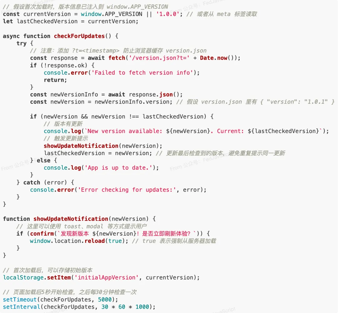 - 比较获取到的版本信息与当前页面加载时的版本信息(通常可以在首次加载时获取并存储在内存或 localStorage 中)。