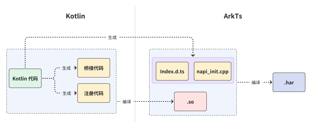 由于抖音鸿蒙版已经基于 ArkTS 完成了大部分基础能力和部分业务开发,接入 KMP 后需要在充分复用现有 ArkTS 能力的同时,支持业务侧在 ArkTS 场景下调用 KMP 代码。因此,我们需要建设 Kotlin 与 ArkTS 之间的跨语言交互能力,为开发者提供便捷、高效的跨语言交互体验,助力 ByteKMP 在业务顺利落地。