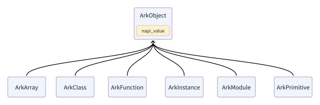 除了实例对象外还有模块、类、方法、数组、基础类型等对象,由于所有对象都需要napi_value,我们可以定义一个基类 ArkObject 来持有napi_value,其他对象均继承自 ArkObject 并提供特定的能力。