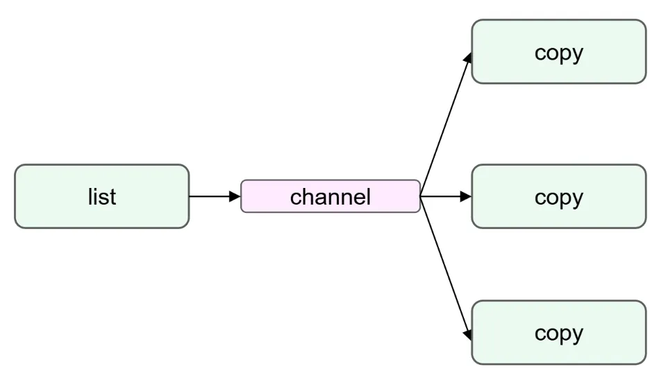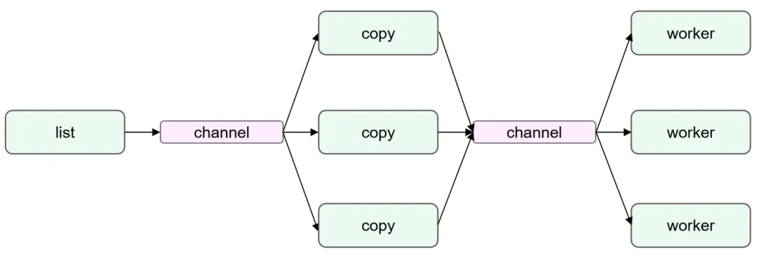 一种操作流程的组织形式可能类似于上图,左边的routine,调用list objects的接口,或者从文件列表中获取所有的对象列表,然后再把这些对象,放入到一个channel中;然后右边的copy的routine,具体执行copy每个对象的动作。