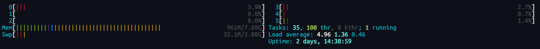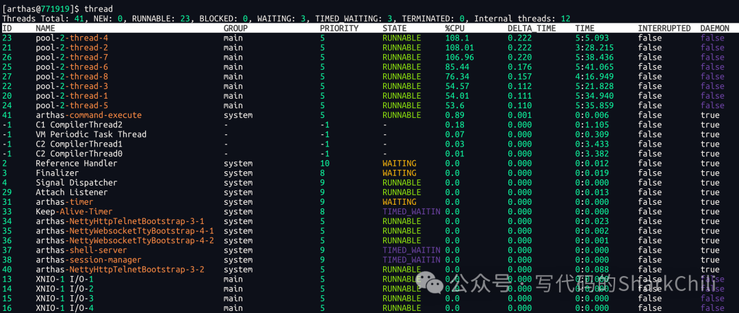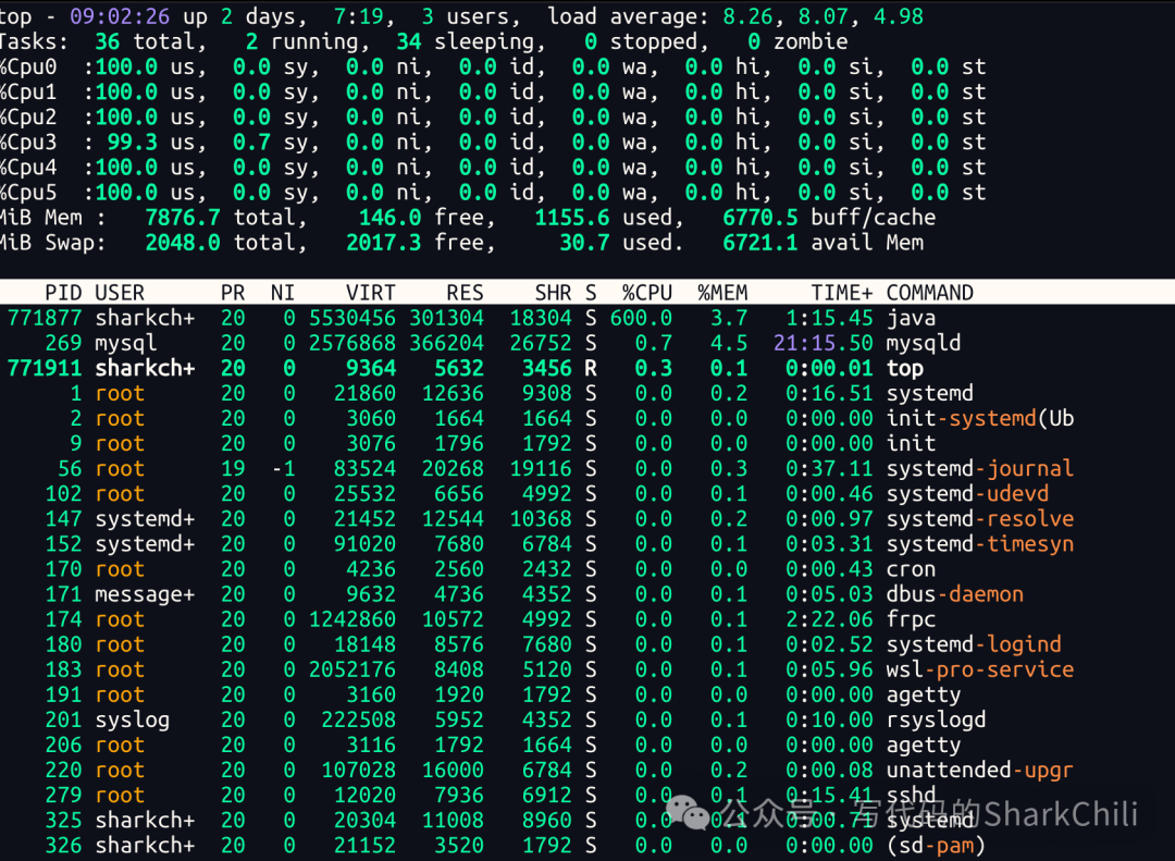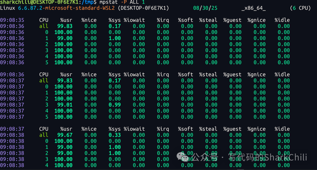 从笔者的输出结果来看,各CPU核心的使用率分布相对均匀,没有出现某个CPU核心使用率异常飙升的情况。如果某个CPU核心使用率持续接近100%,而其他核心相对空闲,则可能说明存在以下问题: