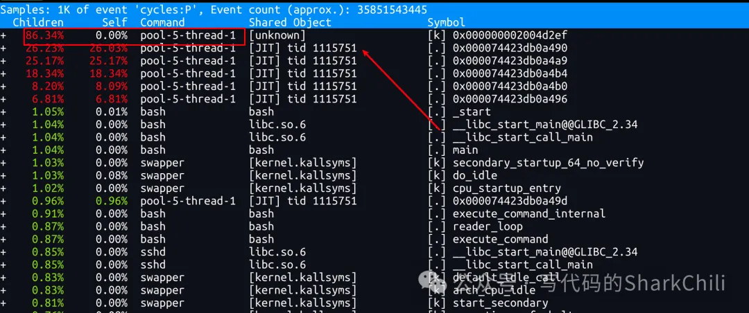 此时,通过sudo perf report查看报告,可以看到一个pid为1115751的Java进程对应线程CPU使用率飙升到86,此时我们就可以基于这条信息到指定的进程上查看该线程是否存在密集的运算: