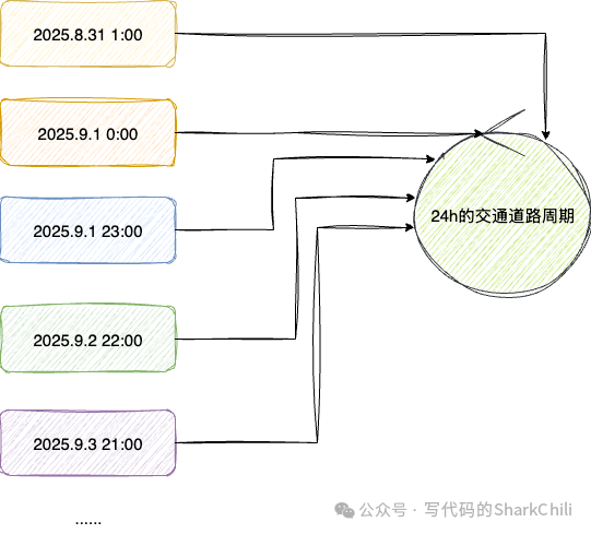 为了规避相同周期频率导致的lockstep即锁同步采样,我们可以适当降低频率避免与交通周期时间同步,保证一天的数据能够在一个周期内被完整地采集到,而本例最好的做法就是将定时间隔改为23h,这样一来每个23天的样本周期就会得到一天中所有时间的数据就能做到全面地了解到交通情况: