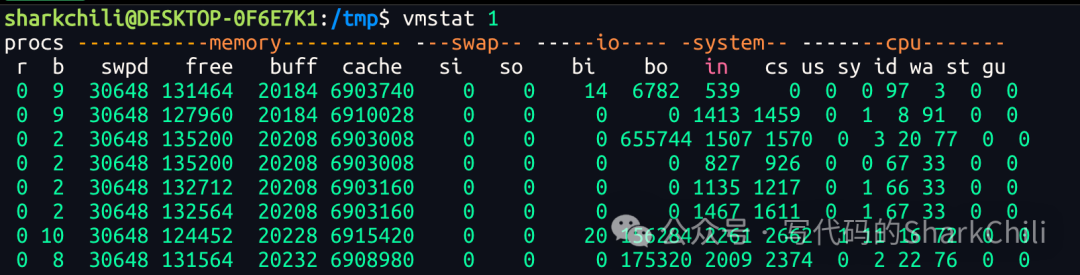 vmstat用于查看虚拟内存、I/O、CPU运行状态等指标,在进行巡检时我们一般使用vmstat 1进行每隔1秒一次的输出,以观察系统的实时状态。以笔者服务器为例,输出结果如下: