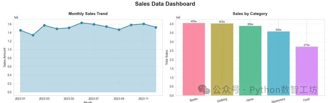 运行上述代码后,将生成一个包含四个子图的综合仪表板,清晰展示销售数据的多个维度。同时,控制台会输出关键统计指标,帮助快速了解数据概况。