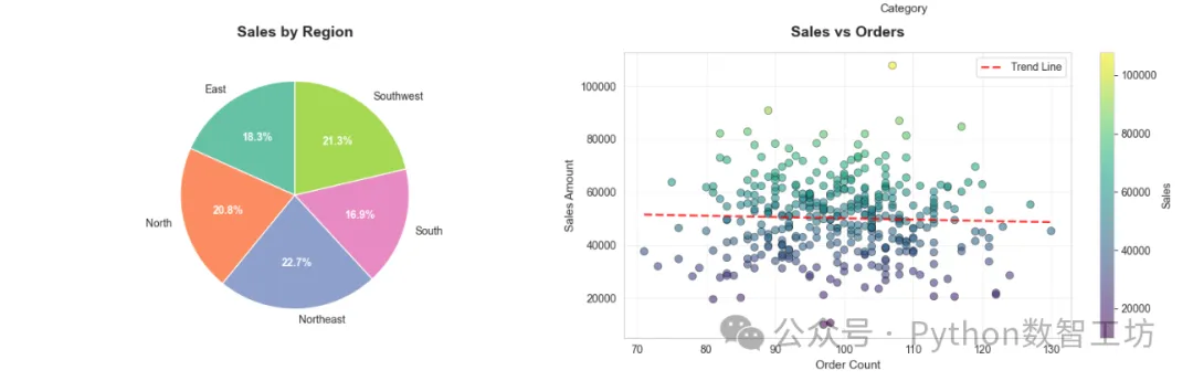 - 生成365天的销售数据,包含日期、销售额、订单数量、产品类别和地区信息