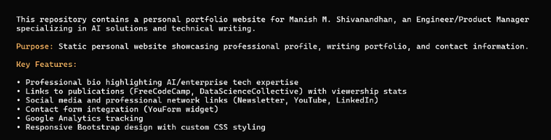 此后即可开始自然语言交互,例如提问:“这个仓库是做什么的?” 以下为个人网站项目的实际输出示例: