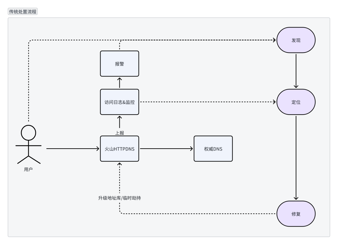 针对 HTTPDNS 调度不准风险,业界主流处置流程采用 “发现-定位-修复” 三步闭环机制,具体如下: