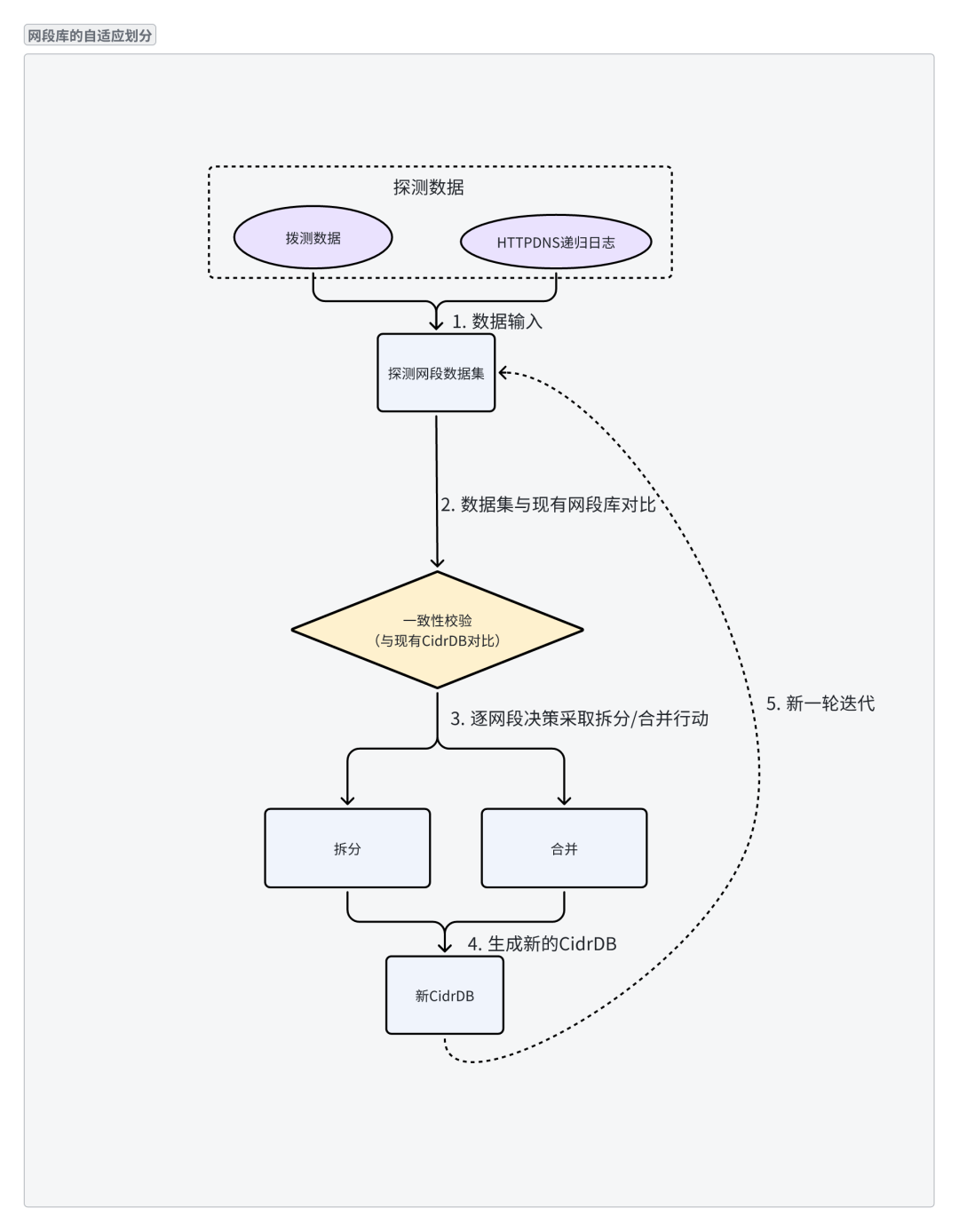 背景:外部 CDN 厂商的调度结果会随网络拓扑和调度策略持续变化,而静态网段库划分方式固定,难以实时跟踪调度结果变化。为解决这一问题,网段库动态划分算法通过“数据输入—一致性校验—网段调整—结果输出”的闭环流程,实现了网段库的自适应动态划分。