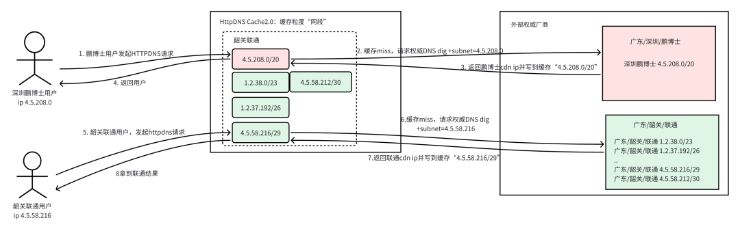 火山 HTTPDNS Cache2.0 通过 “自研网段库 + 动态适配” 的创新架构,实现了对上述方案的突破:一方面,其依托自研的 IP 网段库,实现了网段级别的细粒度缓存能力,解析精准度不逊于海外某厂商的动态方案;另一方面,该方案不依赖权威 DNS 的 ECS 协议实现 —— 即便面对实现 ECS 协议不标准的权威 NS,仍可通过自研网段库确定合理的缓存粒度,将 “缓存污染” 的影响范围控制在